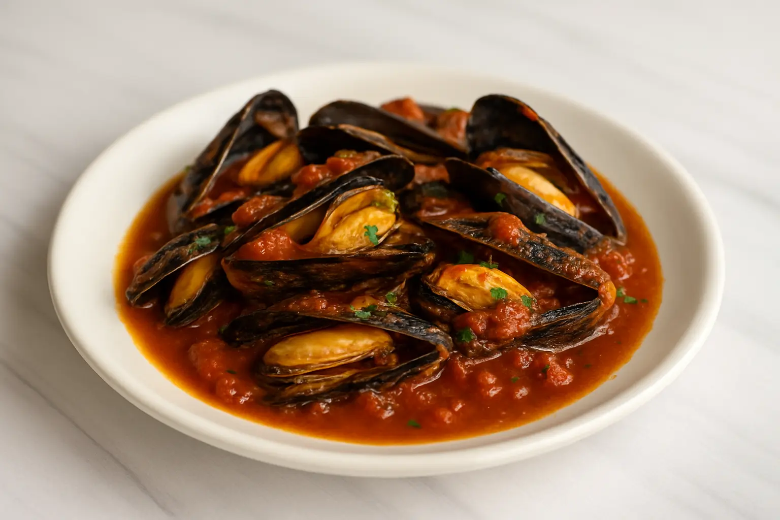 Fresh Crete-style mussels simmered in tomato, garlic, and wine